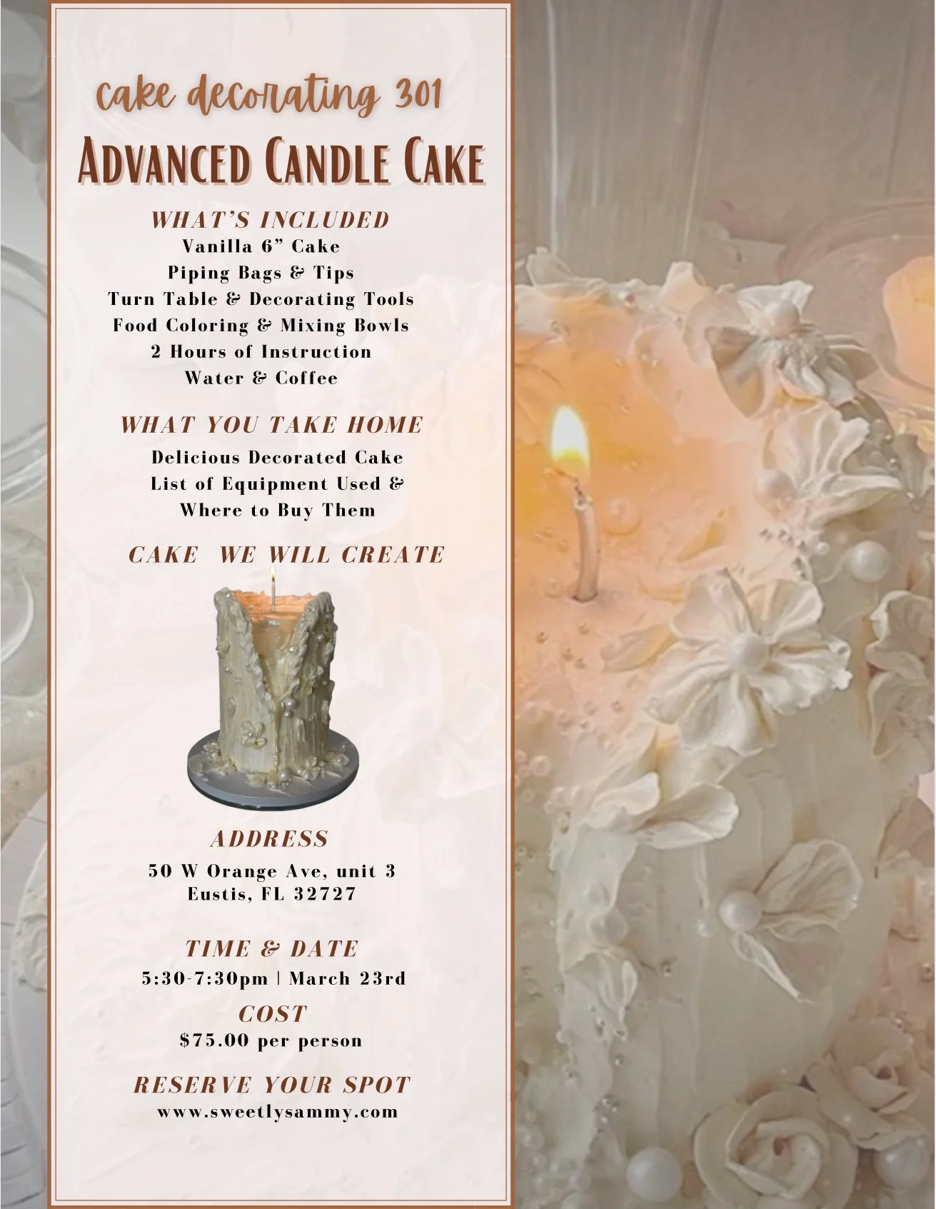 Do you think your decorating skills are pretty good? Are you looking for a new challenge and to hone your skills even more? Then this is the class for you! Join Sammy as we tackle the viral candle cake. This course includes cake, sculpting and advanced decorating techniques.